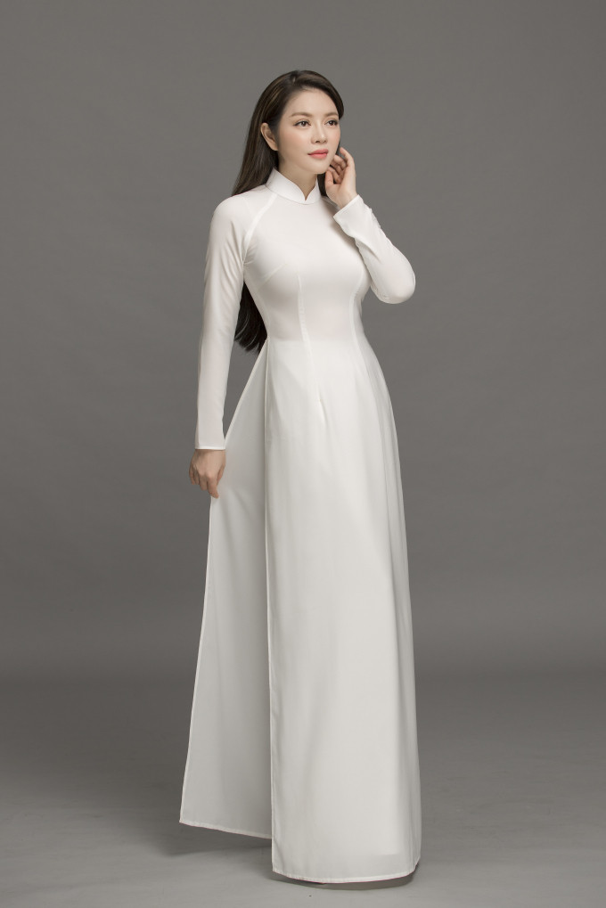 Bộ áo dài trắng của Thuận Việt được thiết kế theo phom dáng truyền thống với phần cổ cao, tay áo dài, ôm sát như in vào vóc dáng của người đẹp. Chất liệu voan và lụa mềm góp phần tôn trọn số đo ba vòng gợi cảm của cô. Trong trang phục này, người đẹp họ Lý trông như thiếu nữ Việt xưa, dịu dàng, đằm thắm.