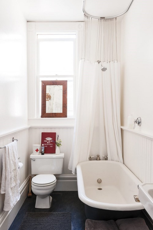 Phòng tắm sơn màu trắng tạo không gian mở, nhấn nhá với rèm tắm, vòi hoa sen và gương tăng cảm giác về chiều cao của căn phòng.