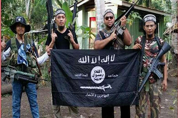 Các phần tử của nhóm khủng bố Abu Sayyaf ở Philippines chụp hình với cờ IS và các tay súng Malaysia mới gia nhập - Ảnh: Cơ quan chống khủng bố Malaysia