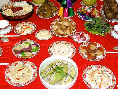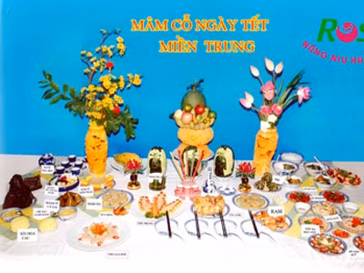 Các món mặn như: tôm rim, thịt kho tàu, cuốn ram, thịt heo, gà rán, thịt phay, nem, chả, tré,thịt ngâm nước mắm…Rồi có thêm các món đồ mộc như: măng khô xào thịt, mít trộn, giá xào nham… Món tráng miệng rất phong phú, có mứt cam quật, mứt sen, mứt gừng như miền Bắc,có mứt me, mứt dừa…như miền Nam.Ngoài ra có thêm mứt củ bình tinh, mứt củ khoai mài, mứt củ sen, mứt chanh, mứt khế. Bánh thì có bánh sen tán,bánh măng,bánh mận, bánh bó mứt, bánh thuẩn, bánh phục linh, bánh nổ, bánh tổ….