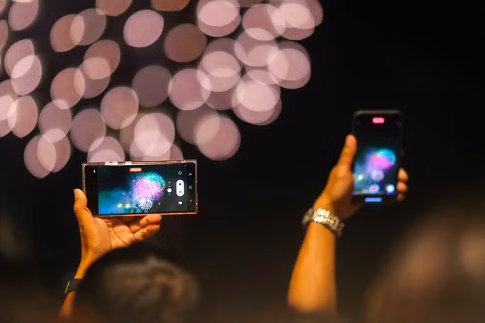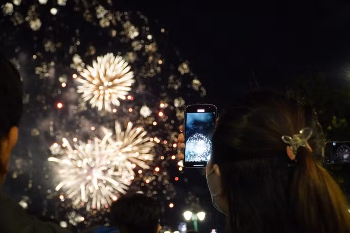 Nhiều người dân tranh thủ lấy điện thoại ghi lại khoảnh khắc TP HCM ngập trong ánh sáng của màn pháo hoa đẹp mắt.