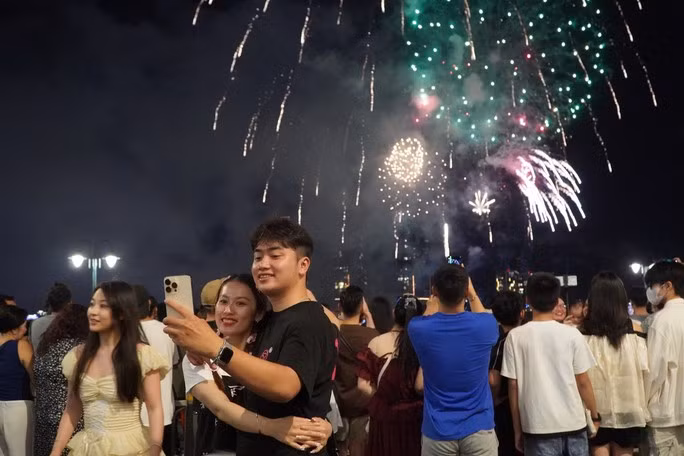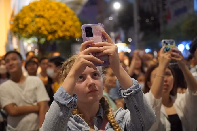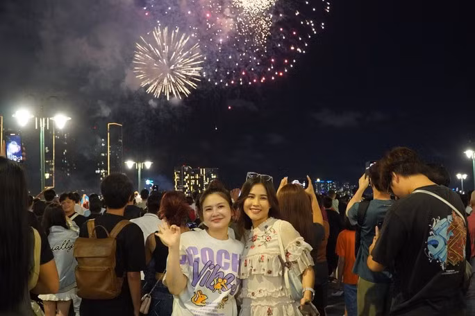 Nhiều du khách nước ngoài ghi lại khoảnh khắc pháo hoa tung bay trên bầu trời TP HCM