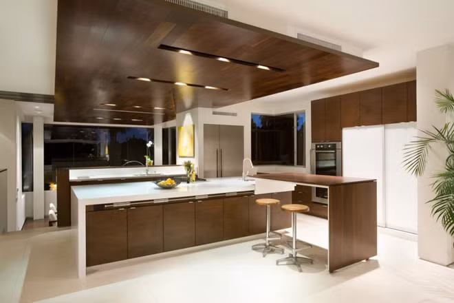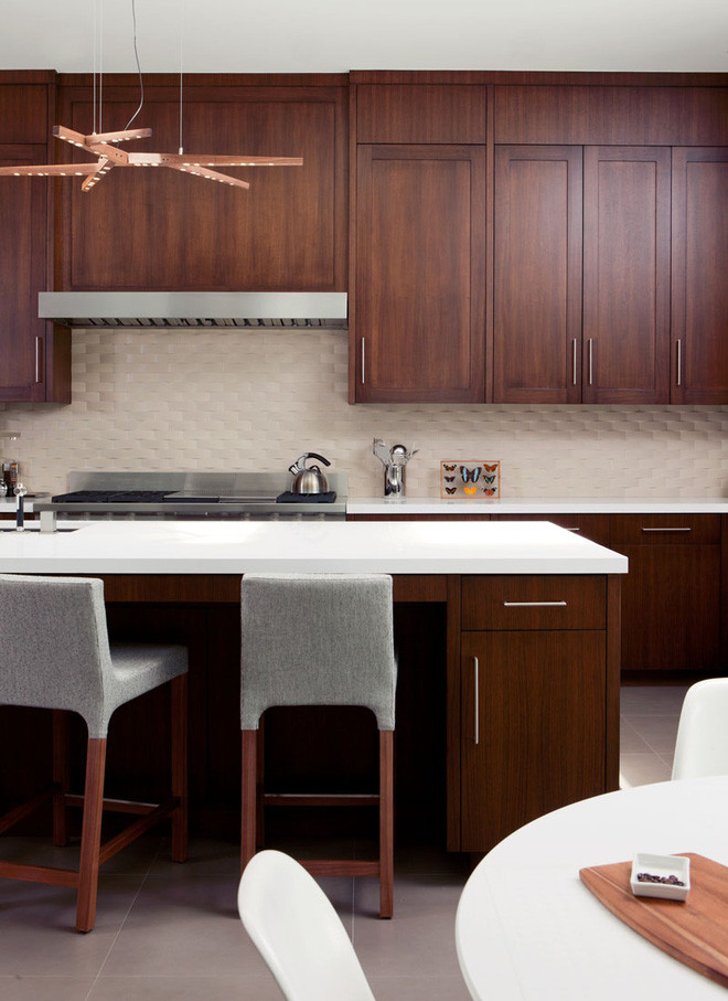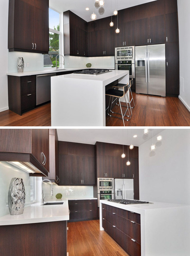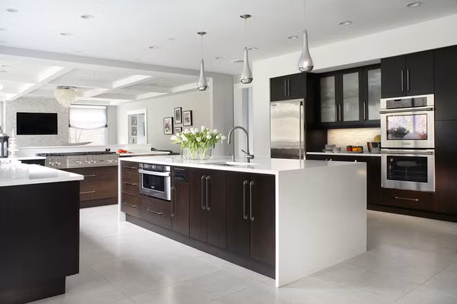 Những căn bếp gia đình trông sang trọng và tinh tế hơn rất nhiều khi sử dụng chất liệu gỗ sẫm màu và gam màu trắng sáng.