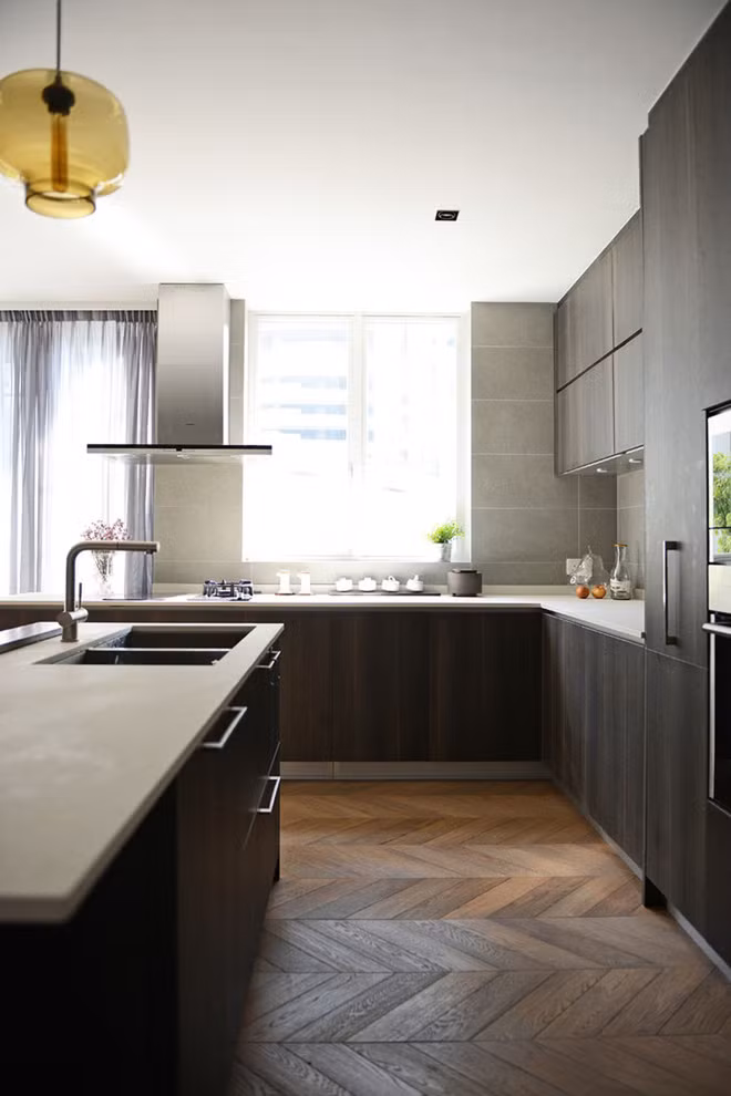 Sự kết hợp hoàn hảo giữa chất liệu gỗ tự nhiên sẫm màu, thép không gỉ mà gam màu sáng trắng mang đến vẻ đẹp hiện đại đầy cuốn hút cho căn bếp.