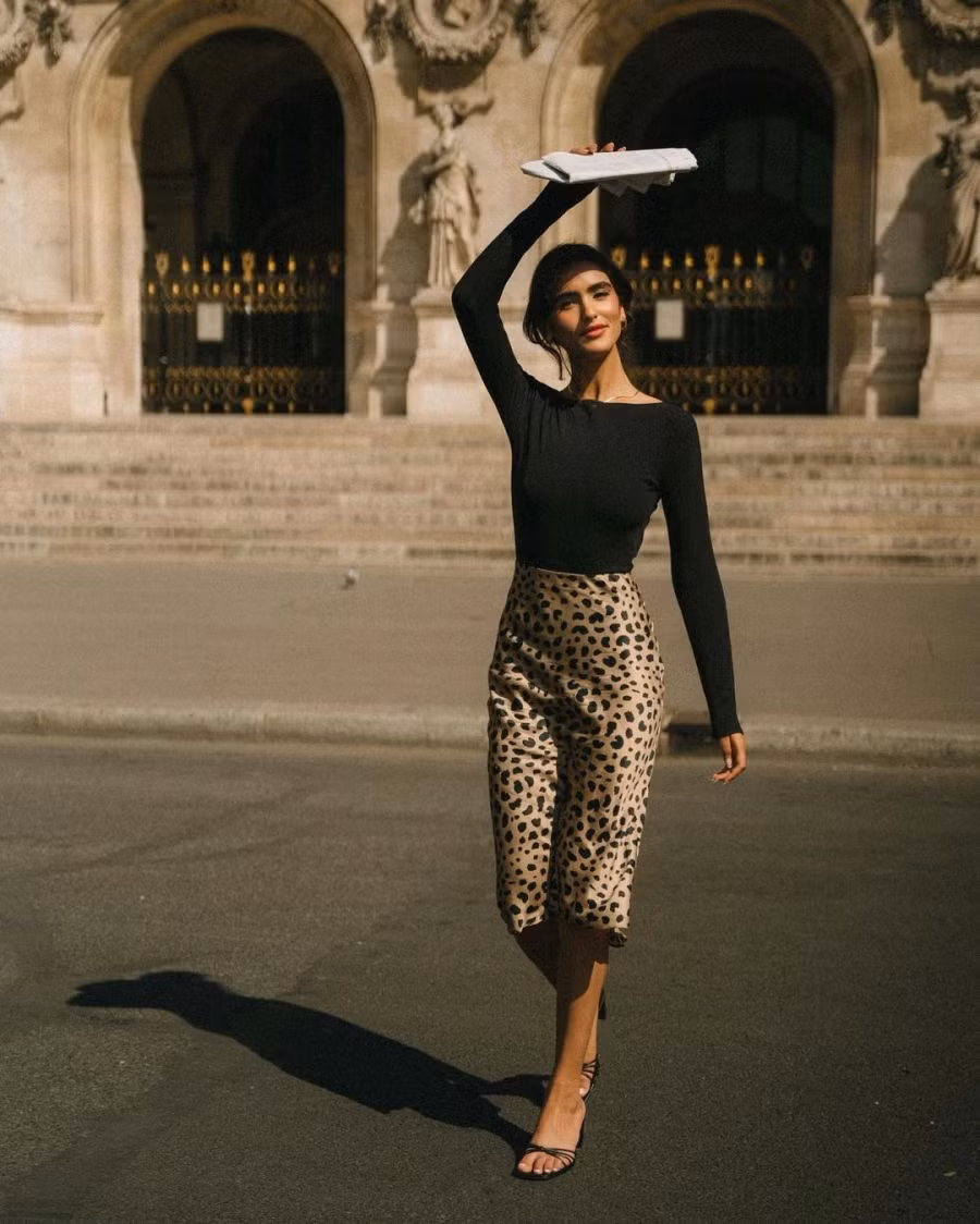 | Trang phục họa tiết da báo còn được gọi bằng nhiều cái tên khác nhau như họa tiết báo đốm, họa tiết da động vật... Mỗi nhà mốt lại mang đến một bản phối khác biệt cho những chiếc đầm liền, chân váy, áo kiểu, jacket... da báo. Do vậy dù có chung một cái tên nhưng trang phục mang họa tiết này lại có vô số cách hiển thị khác nhau. Ảnh: @junybreeze |