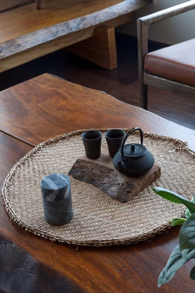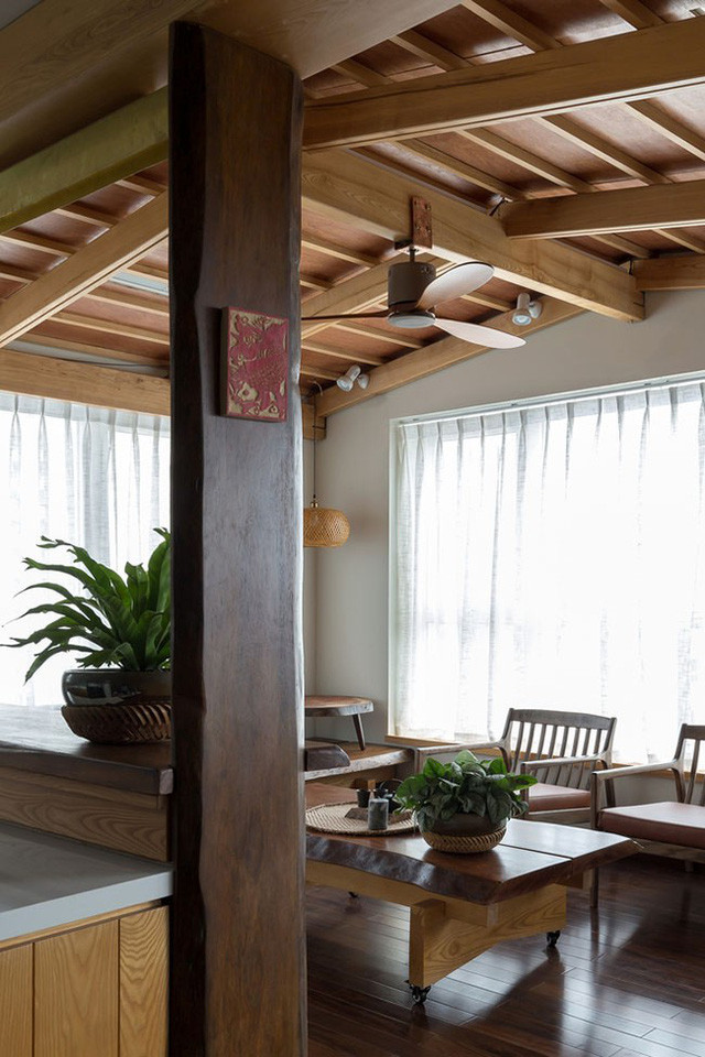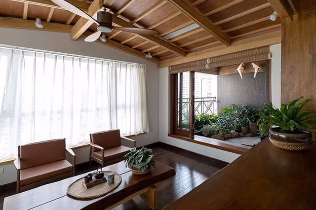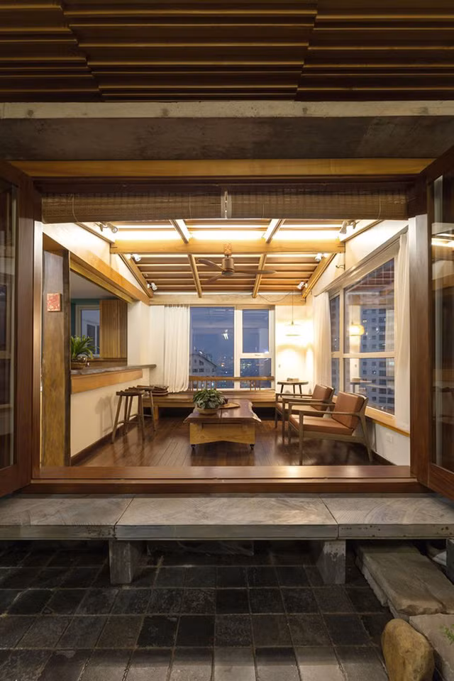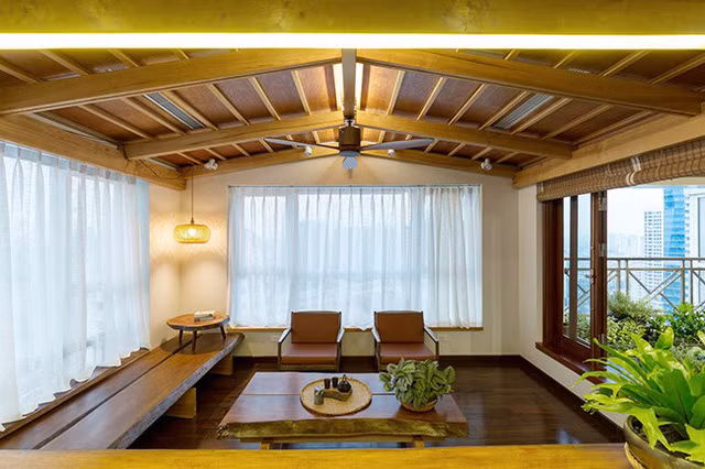 Phòng uống trà với cả 3 hướng thông thoáng, đây cũng là chức năng liên kết và mang nắng gió vào toàn bộ căn hộ.