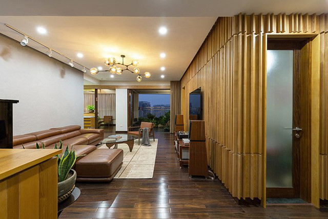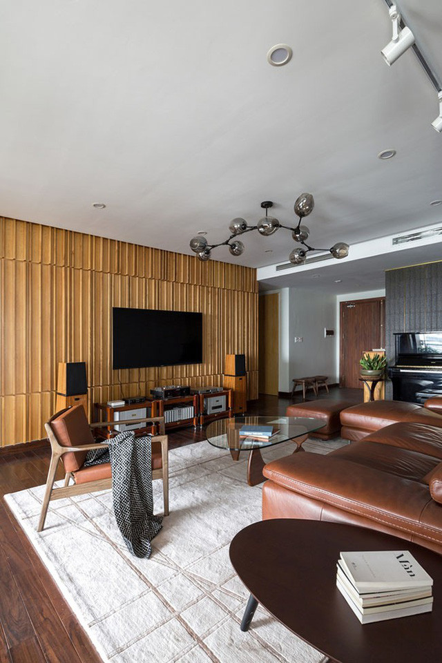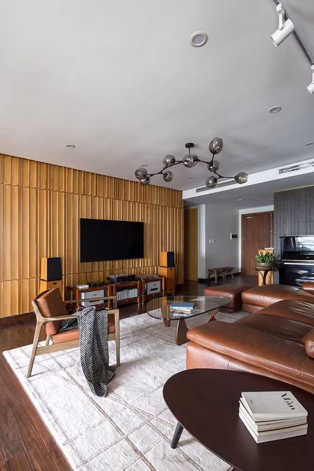 Phòng khách trước đây thiếu ánh sáng, ảm đạm nay đã trở nên rực rỡ, sáng sủa với một bức tường gỗ thơm vừa mang tính chất trang trí vừa cách âm hiệu quả.