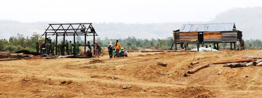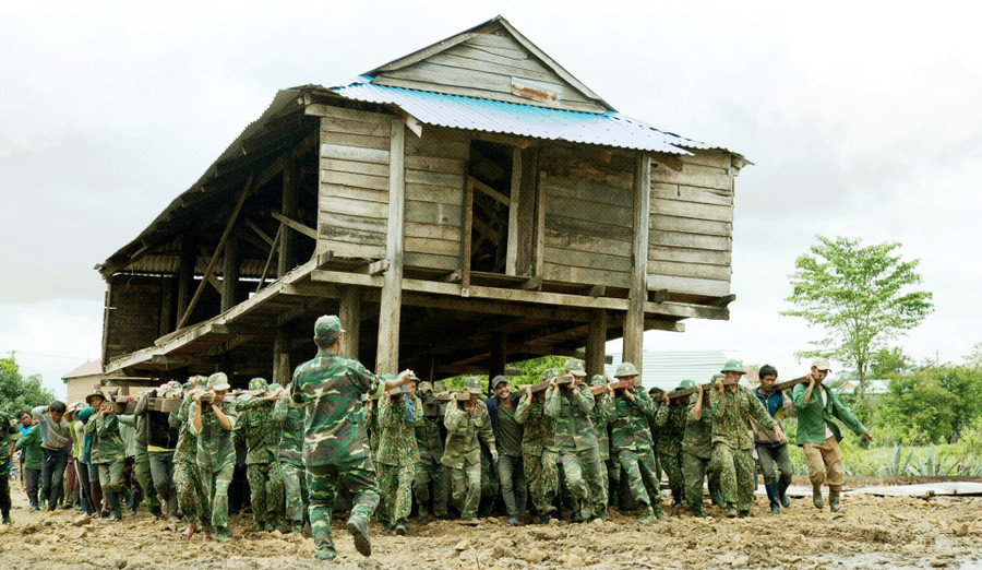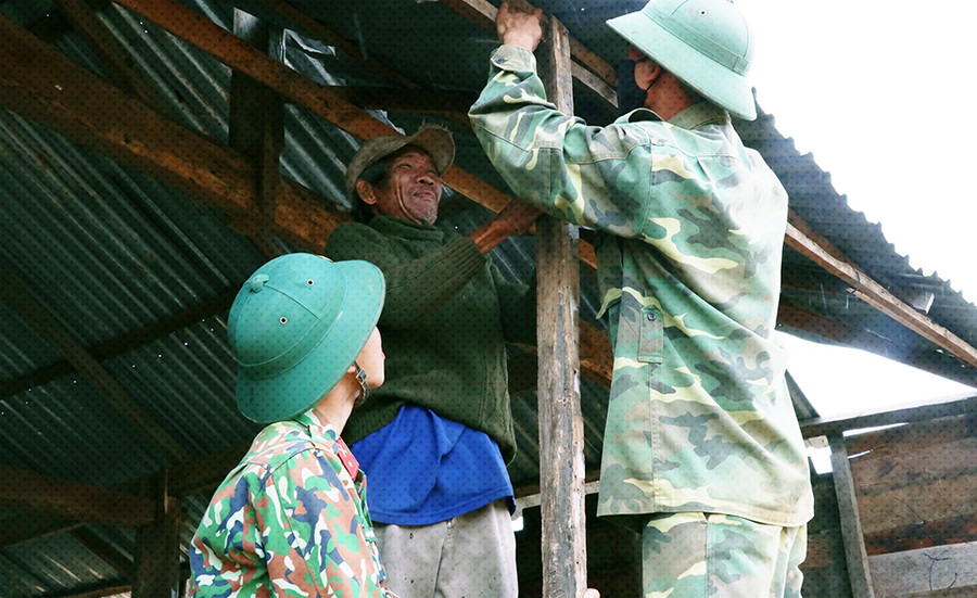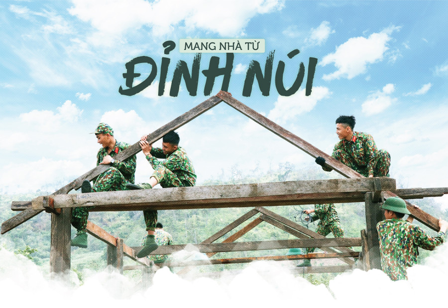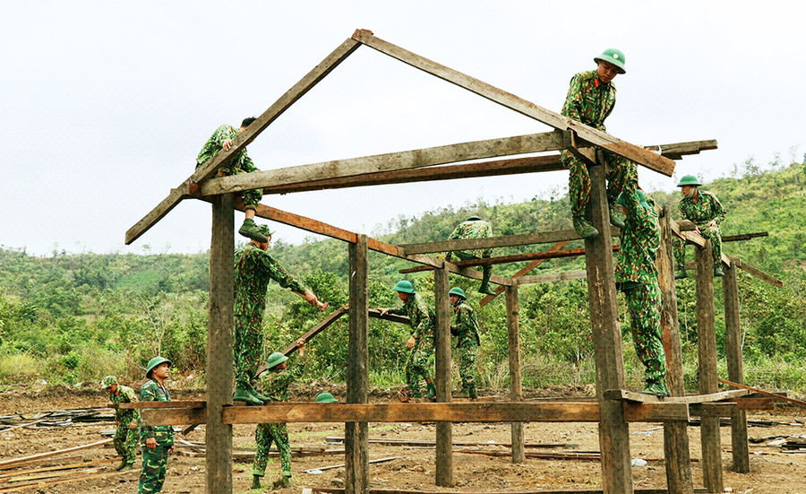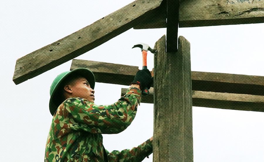 Người lính trẻ tỉ mỉ đóng đinh dựng nhà