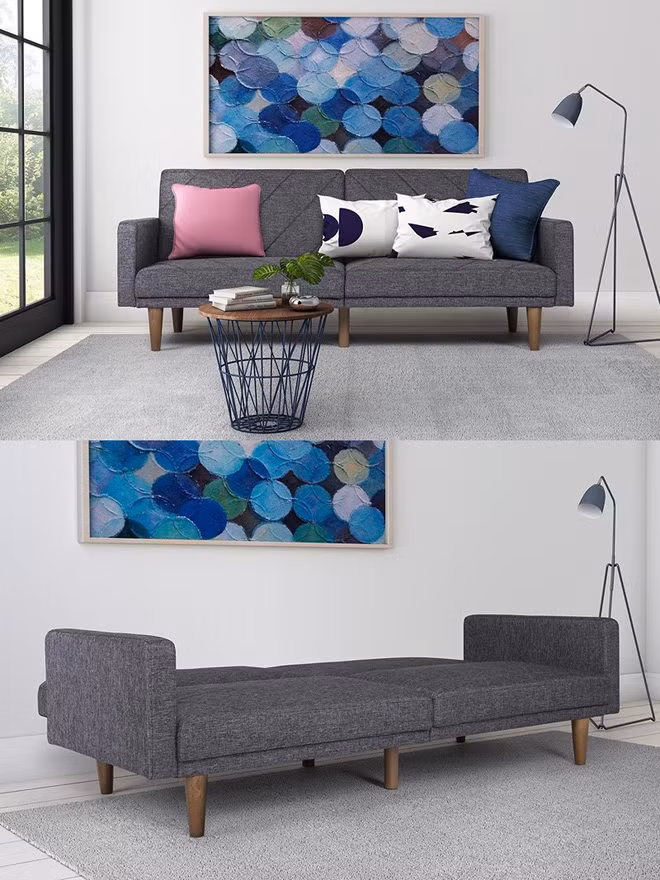 Sofa Futon mang hơi hướng trung cổ: Kiểu sofa Futon thời gian gần đây rất được ưa chuộng với sự linh hoạt trong biến đổi chức năng của chúng. Chiếc sofa Ftuon mang hơi hướng trung cổ này không ngoại lệ. Bộ khung gỗ thanh mảnh được lấy cảm hứng từ thiết kế Scandinavian, có thể mở rộng thành một chiếc giường futon sẽ khiến bạn phải bất ngờ về sự đa năng của chúng.