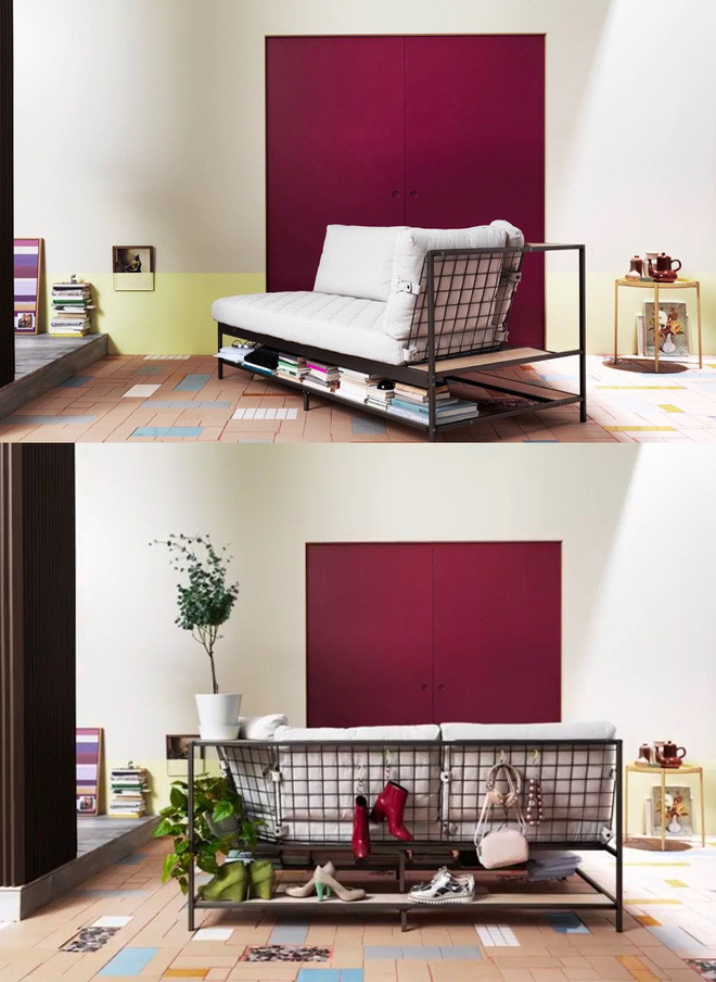Sofa kiêm giá treo đồ phía sau: Thay vì phần khung bằng gỗ truyền thống, mẫu sofa Ikea Ekebol này sử dụng phần khung bằng kim loại với phần tựa lưng là tấm kim loại đan. Nhờ thiết kế này, bạn có thể tận dụng không gian phía sau sofa làm giá đồ treo mũ, ví, chìa khóa rất tiện. Mẫu sofa này đặc biệt phù hợp với những căn hộ nhỏ của người độc thân.