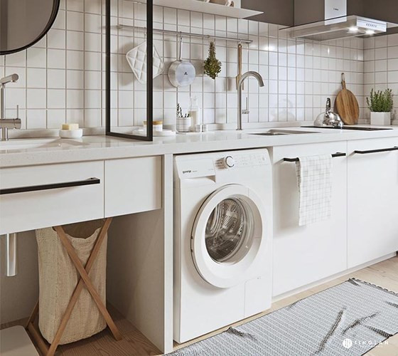 Đặt máy giặt trong nhà bếp là một cách để tiết kiệm không gian.
