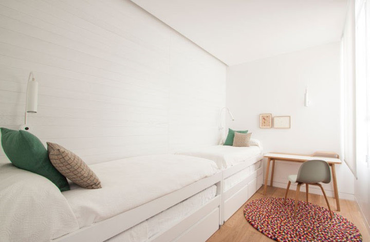 Đây là phòng ngủ thứ hai. Như bạn thấy, nó rất dài và hẹp với hai giường dọc theo bức tường gỗ trắng.