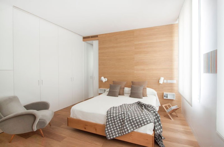 Đây là phòng ngủ chính. Nằm đối diện với cửa sổ là một bức tường tủ trắng. Do màu sắc của nó, chiếc tủ này gần như hoà trộn vào các bức tường xung quanh.