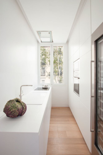 Ngôi nhà có bếp nhỏ màu trắng. Ánh sáng từ các cửa sổ phản ánh trong không gian làm cho nó sáng và thoáng mát.