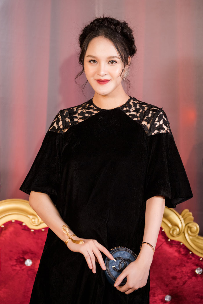 MC Bùi Việt Hà diện bộ áo dài với chất liệu voan đen xuyên thấu vừa cổ điển mà cũng rất hiện đại. Cô sử dụng phụ kiện mấn đội đầu đính cườm cầu kỳ, tinh xảo.