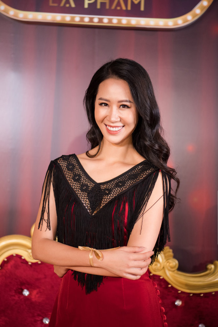 Hoa hậu Dương Thuỳ Linh diện áo dài nhung đỏ với phần cầu vai cách điệu bằng tua rua màu đen độc đáo. Cô chọn phong cách trang điểm nhẹ nhàng, tóc uốn xoăn nhẹ thanh lịch.