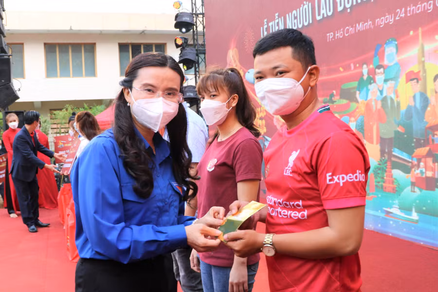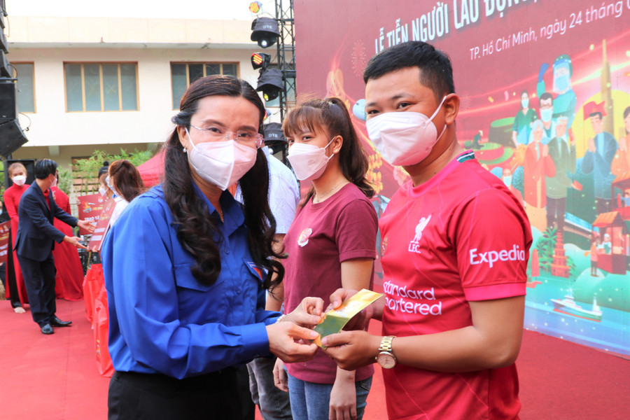 Ngày 24.1, tại TP.HCM, T.Ư Đoàn tổ chức chương trình 'Tết chung một nhà' năm 2022 để tiễn người lao động, sinh viên, tình nguyện viên có hoàn cảnh khó khăn về quê ăn tết.