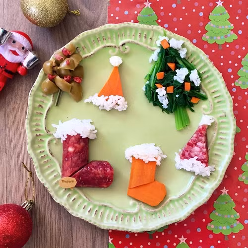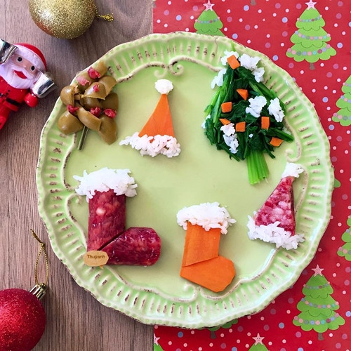 | Mùa Giáng sinh năm nay, chị Thùy Anh trổ tài tạo hình các món ăn theo chủ đề ngày lễ thánh, từ những nguyên liệu dễ kiếm như trái kiwi, dưa chuột, cà chua bi, xúc xích... |