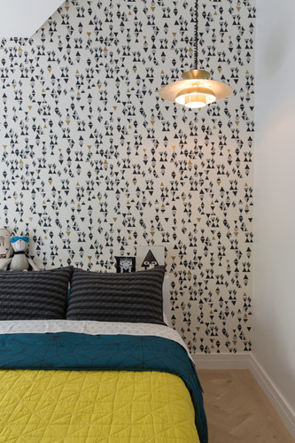 Phòng ngủ ấm áp với tông màu vàng sáng rực rỡ.