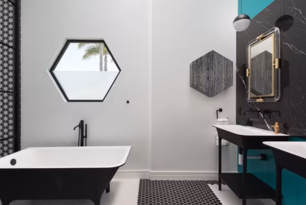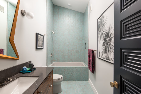 Nhà tắm thanh lịch với màu xanh bạc hà mát dịu.