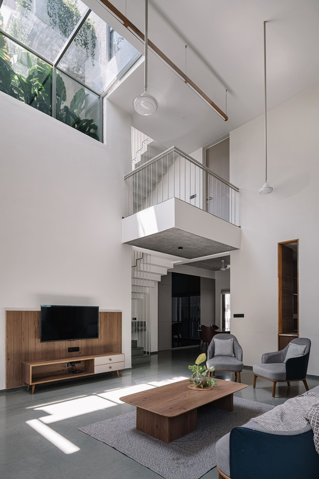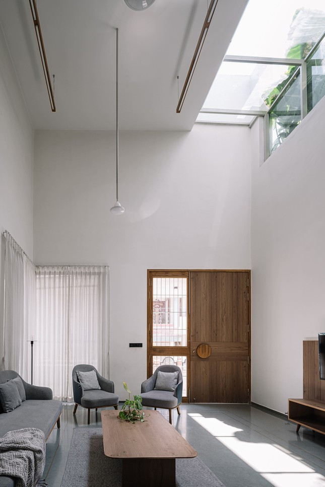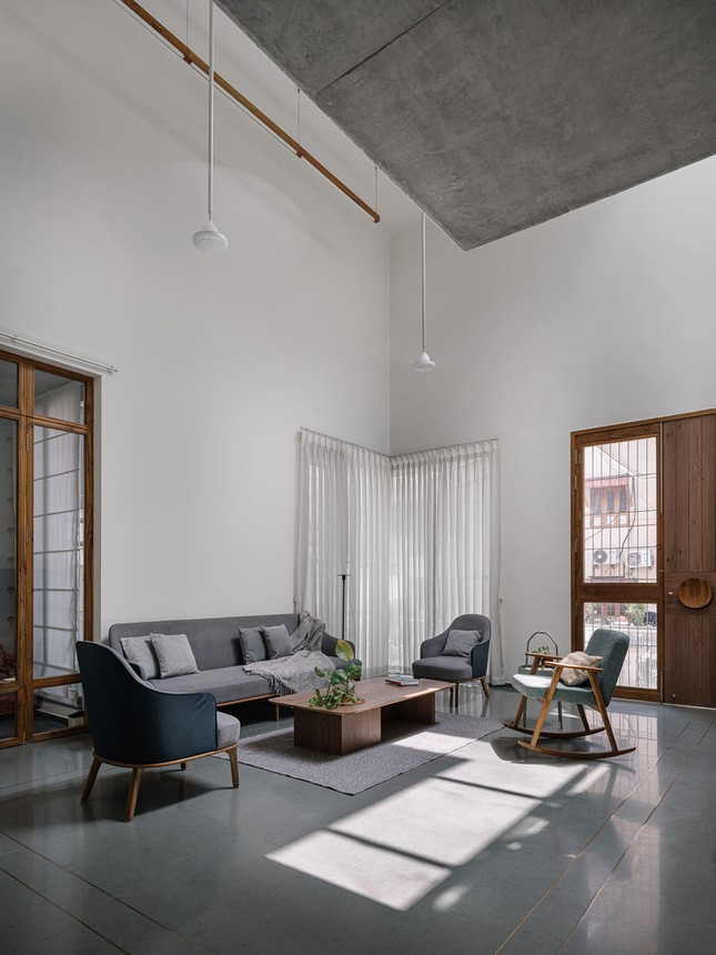 Phòng khách thông tầng có phần mái lấy sáng mang lại cảm giác bất ngờ với không gian đẩy lên theo trục đứng và những vạt sáng chuyển động theo sự di động của mặt trời. Không gian cao rộng nhưng không đem tới cảm giác lạc lõng nhờ trục cầu thang và chiếu nghỉ dẫn lên tầng giữa là phòng của mẹ.