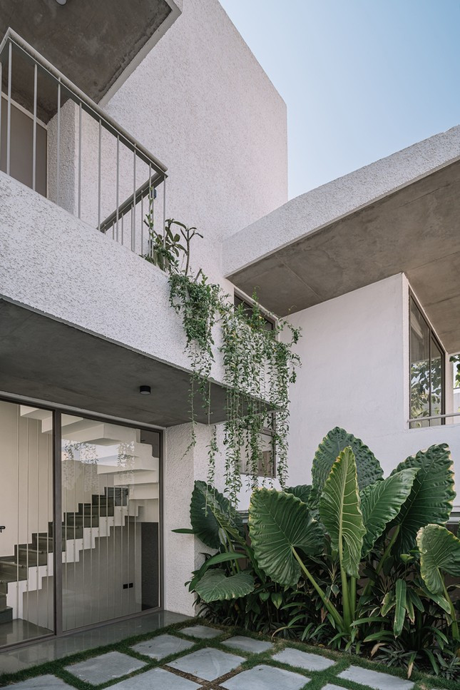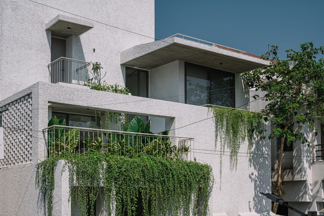 Ngôi nhà phố có cấu tạo như những khối hình gọn gàng xếp chồng lên nhau. Màu trắng chủ đạo kết hợp với những mảng thực vật xanh đan cài khéo léo mang đến vẻ đẹp thu hút cho ngôi nhà.