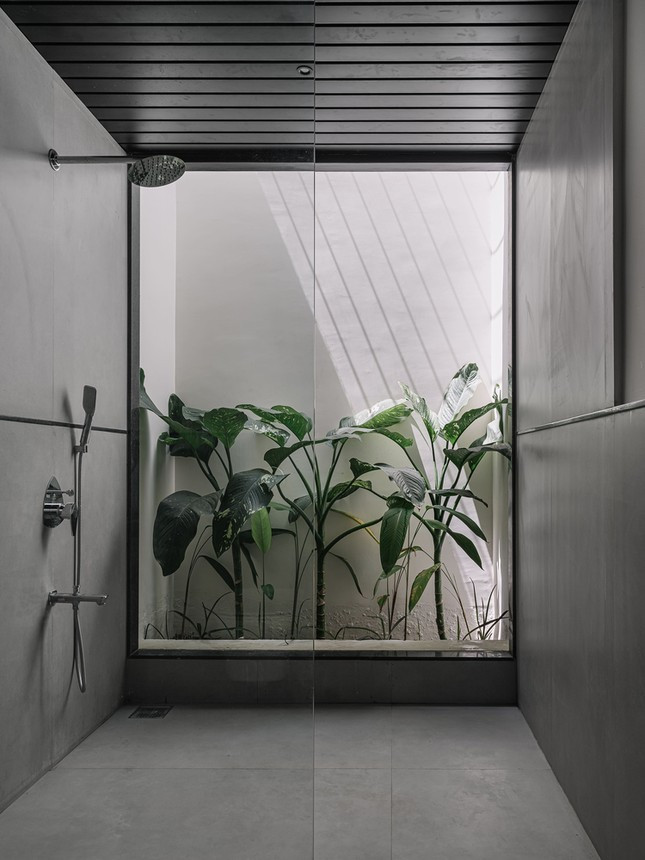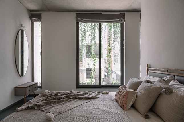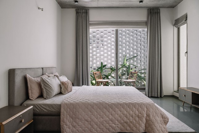 Phòng ngủ chính, ngoài nội thất tối giản với gam màu trung tính, tràn ngập ánh sáng tán xạ qua hệ thống ô gió cùng cửa kính cao rộng còn được mở rộng thêm nhờ phần hiên bên ngoài là nơi trồng cây xanh. Tại đây gia chủ có thể ngồi nhâm nhi trà thư giãn hay có thể chạm nắng mưa ngay trong phòng ngủ.