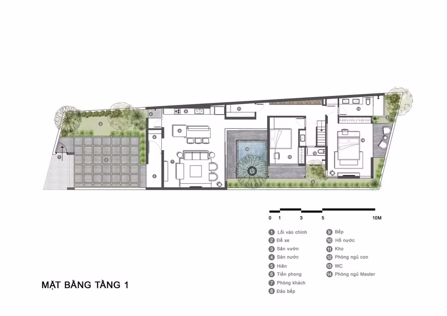 KTS tạo ra 3 sân ở phía trước, giữa và sau của ngôi nhà. Sân trước dành cho sân vườn và bãi đậu xe; sân giữa phân chia khu sinh hoạt chung và khu ngủ nghỉ; sân sau là không gian sân vườn và là nơi để gia chủ tập yoga.