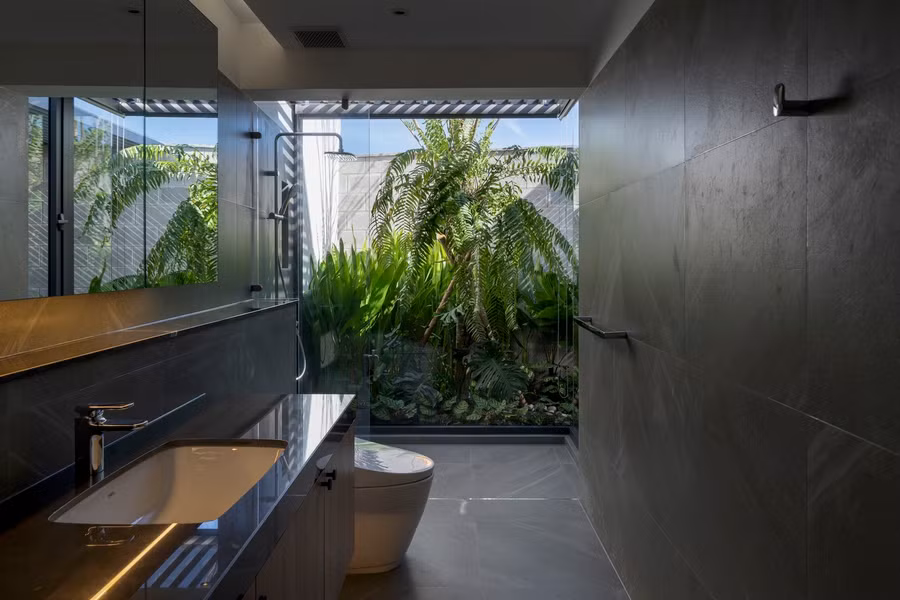 Sân giữa và sân sau của ngôi nhà được kết nối với nhau, không bị gián đoạn, tạo điều kiện thông thoáng và tạo cảm giác sân vườn dường như bao trùm toàn bộ khối ngủ.