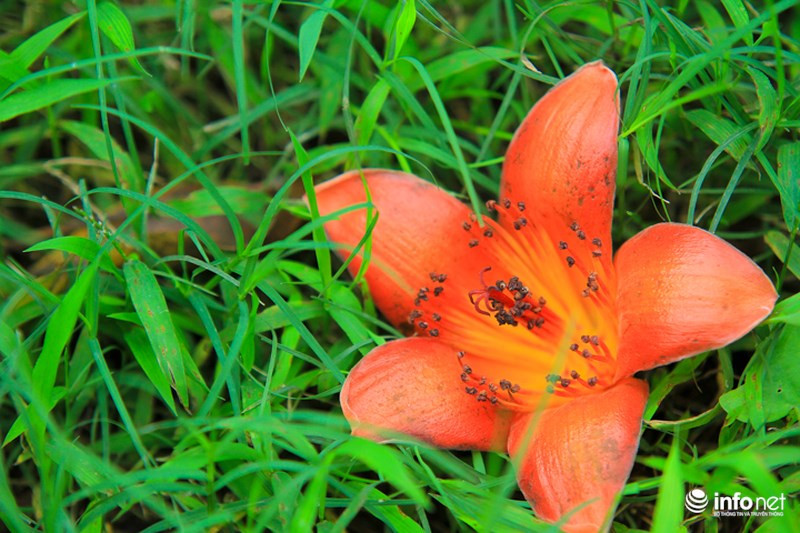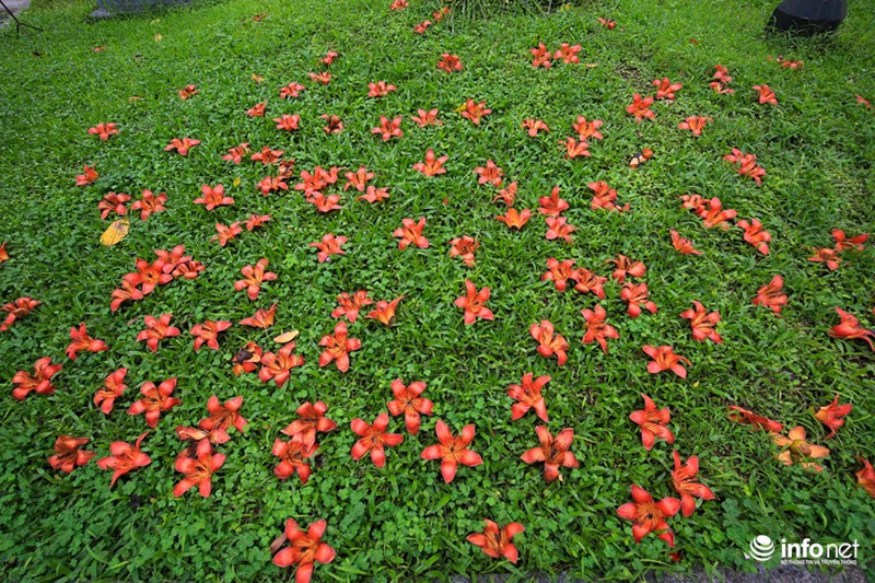 Những bông hoa gạo đỏ rực rơi trên nền cỏ xanh tạo nên sự tương phản thị giác tuyệt đẹp cho người xem.
