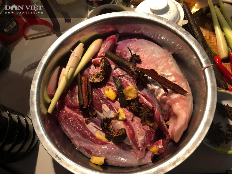 Bước 1: Quế, hồi, gừng đập dạp vào nồi đổ nước ngập thịt, cho thêm chút muối vào, đun sôi chú ý vớt hết bọt rồi để nồi liu riu luộc cho thịt mềm, có thể dùng nồi ủ, đun sôi hớt hết bọt rồi ủ qua đêm sáng ra đun lại lần nữa ủ lại khoảng 2 tiếng là mềm ngay.