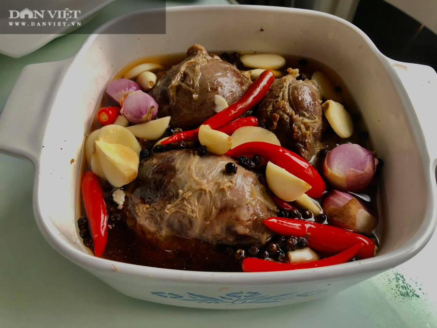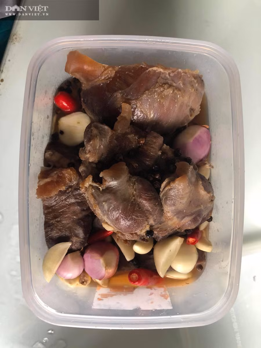 Ban để ở ngoài khoảng 1 ngày đến 2 ngày tuỳ thuộc vào thời tiết rồi cho vào tủ lạnh bỏ ra ăn dần mỗi lần lấy ra thái mỏng chấm tương ớt , thái mỏng xong đổ một chút nước ngâm thịt cùng ớt tỏi rưới lên thịt rất ngon.