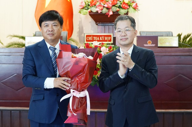 Ông Lương Nguyễn Minh Triết (bìa trái) nhận hoa chúc mừng từ ông Nguyễn Văn Quảng, Bí thư Thành uỷ Đà Nẵng