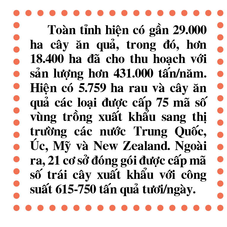 Toàn tỉnh hiện có trên 4.100 ha chanh dây và hơn 6.300 ha chuối. Để hỗ trợ doanh nghiệp, HTX, người dân chuẩn bị điều kiện cần thiết cho xuất khẩu, thời gian qua, ngành Nông nghiệp và PTNT đẩy mạnh tuyên truyền, tập huấn giúp bà con nông dân nhận thấy tầm quan trọng của việc tuân thủ quy trình sản xuất sạch theo hướng bền vững, đảm bảo an toàn thực phẩm, vệ sinh môi trường. Đồng thời, ngành phối hợp với các địa phương tích cực hướng dẫn, hỗ trợ doanh nghiệp, HTX, người dân thiết lập, xây dựng mã số vùng trồng, mã số cơ sở đóng gói, truy xuất nguồn gốc để phục vụ xuất khẩu.