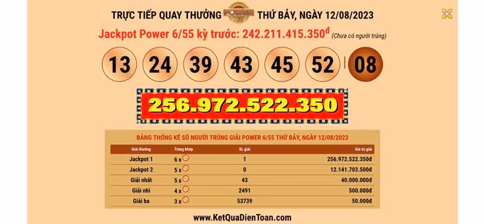 Tối 12-8, Vietlott công bố tại kỳ quay số chiều cùng ngày, có 1 vé số loại hình Power 6/55 trúng giải Jackpot 1 với trị giá gần 257 tỉ đồng.