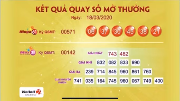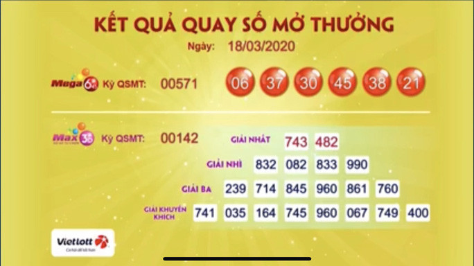 Lúc 19 giờ ngày 18-3, Công ty Xổ số điện toán Việt nam (Vietlott) công bố kỳ quay số mở thưởng 00571, có 1 vé loại hình xổ số Mega 6/45 trúng giải độc đắc (Jackpot) trị giá hơn 62,6 tỉ đồng