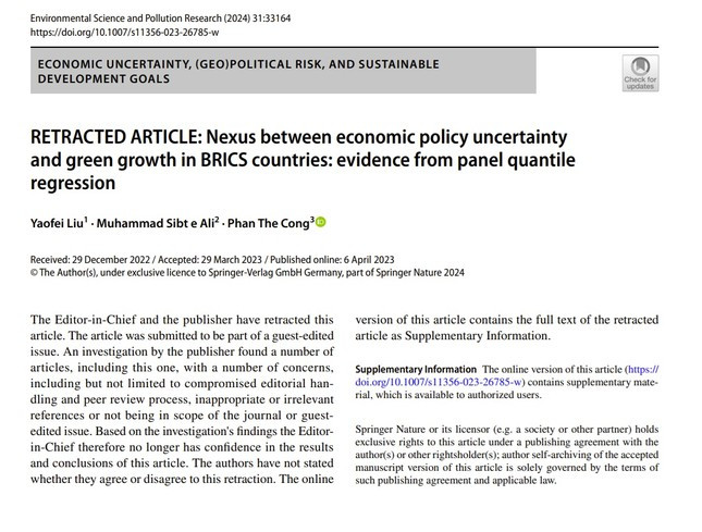 Theo thông báo được đăng trên website của Nhà xuất bản Springer, Tổng biên tập tạp chí Environmental Science and Pollution Research (Khoa học môi trường và Nghiên cứu về ô nhiễm) và Nhà xuất bản Springer (Đức) đã quyết định rút bài báo: Nexus between economic policy uncertainty and green growth in BRICS countries: evidence from panel quantile regression (Mối liên hệ giữa sự không chắc chắn về chính sách kinh tế và tăng trưởng xanh ở các nước BRICS: bằng chứng từ hồi quy phân vị bảng). Bài báo này đã được xuất bản năm 2023 trong một số được biên tập bởi biên tập viên khách mời.