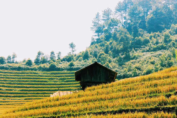 Từng bậc ruộng xếp chồng, đặc quánh màu vàng óng của lúa và nắng, níu trời và đất sát gần nhau hơn. Mọi ngôn từ hoa mỹ dường như vô nghĩa trước cảnh sắc tráng lệ và hùng vĩ này.