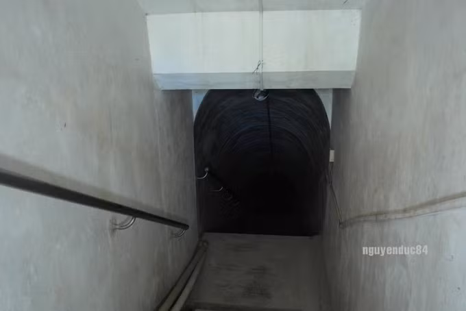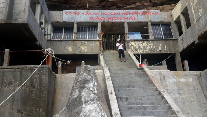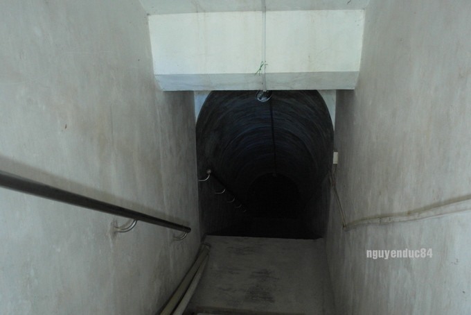 Cửa lên của đường hầm dài 170 m (phía sau tòa nhà) nằm hoàn toàn trong lòng núi đá được đúc bằng bê tông dày để chống chọi với thời tiết khắc nghiệt trên đảo. Một công trình kỳ công của công binh khi khoét núi, vận chuyển nguyên liệu để xây dựng đường hầm dẫn lên phía trên đảo. Trên hình là những bậc thang dẫn lên phía cầu thang lộ thiên khoảng hơn 100 m.