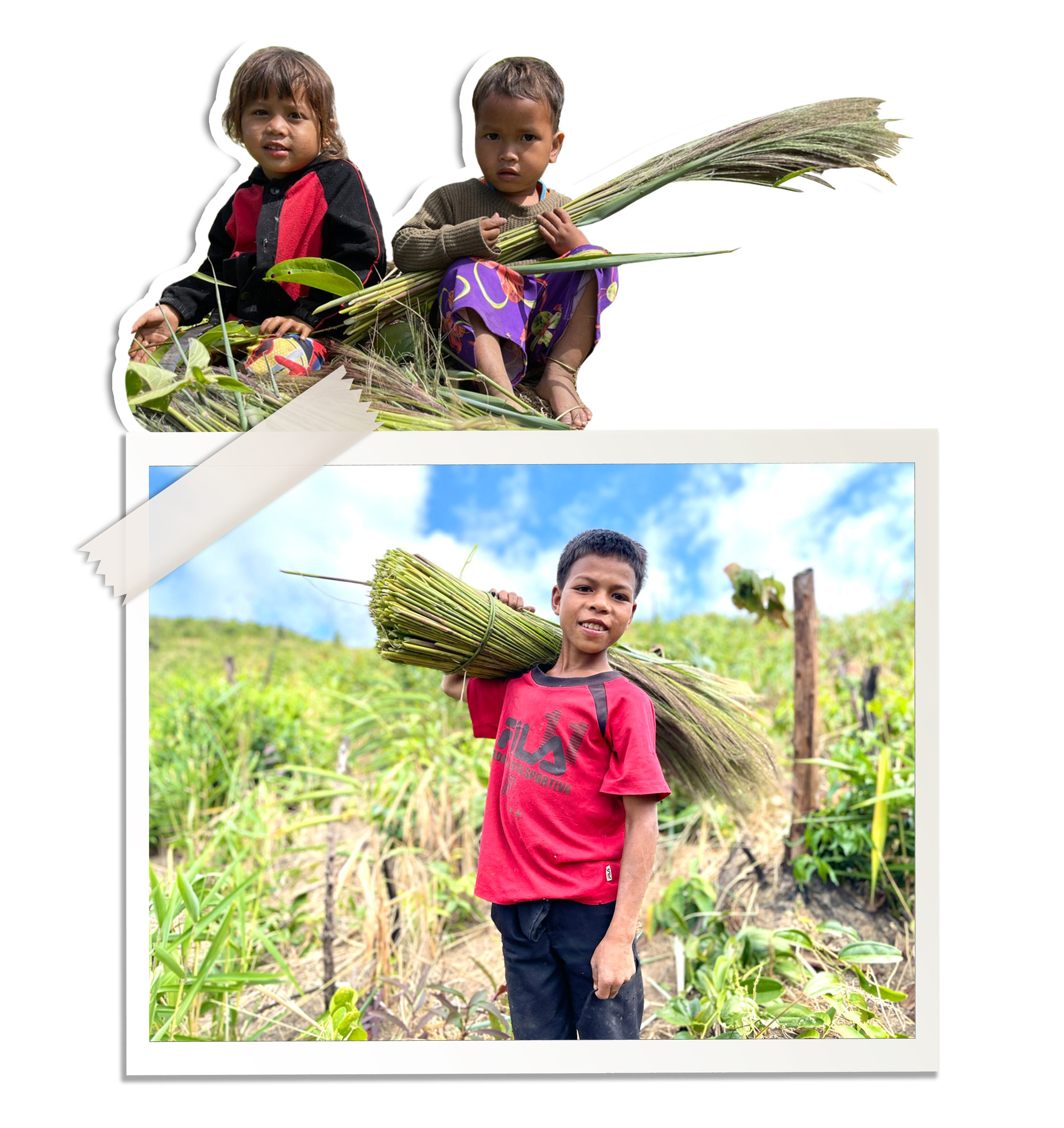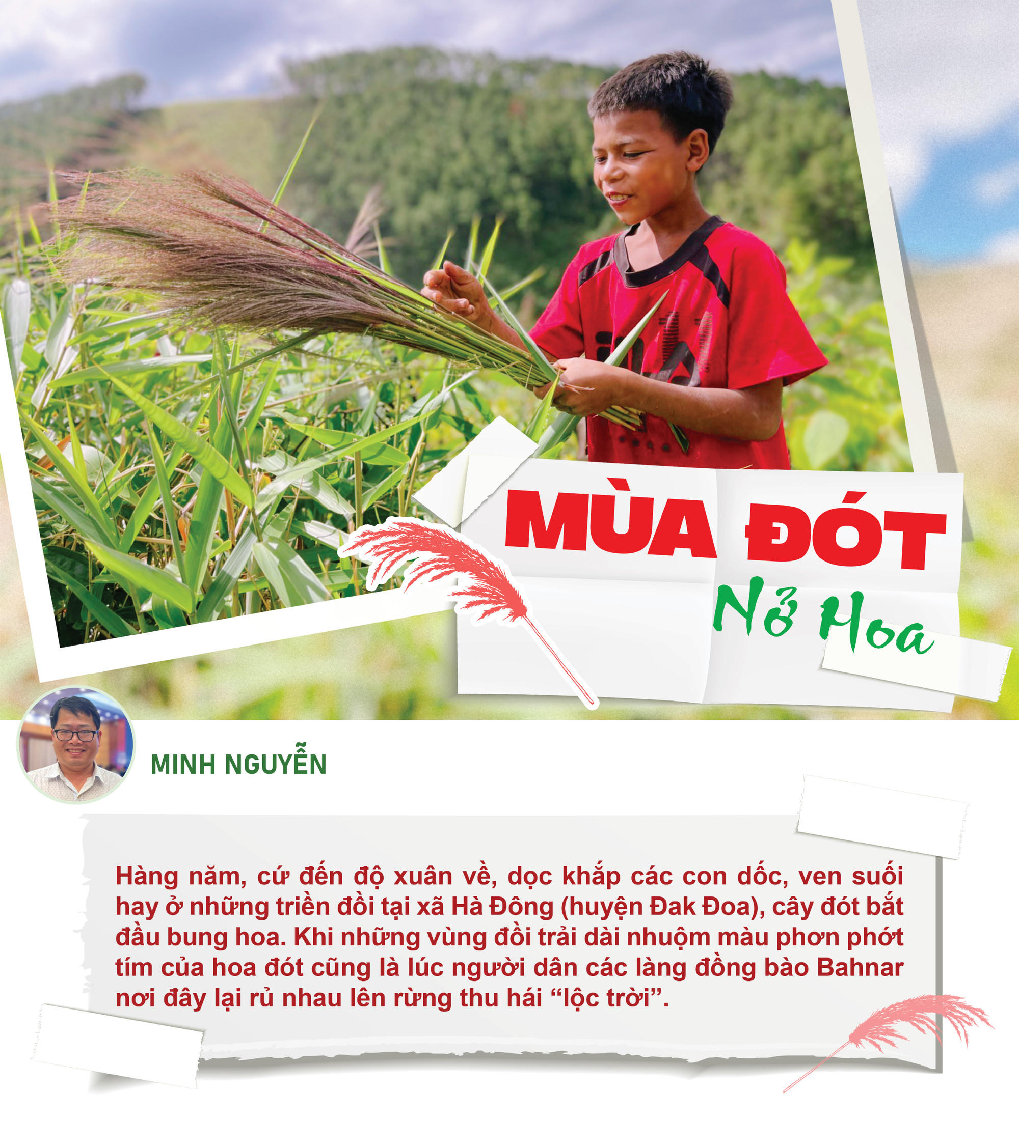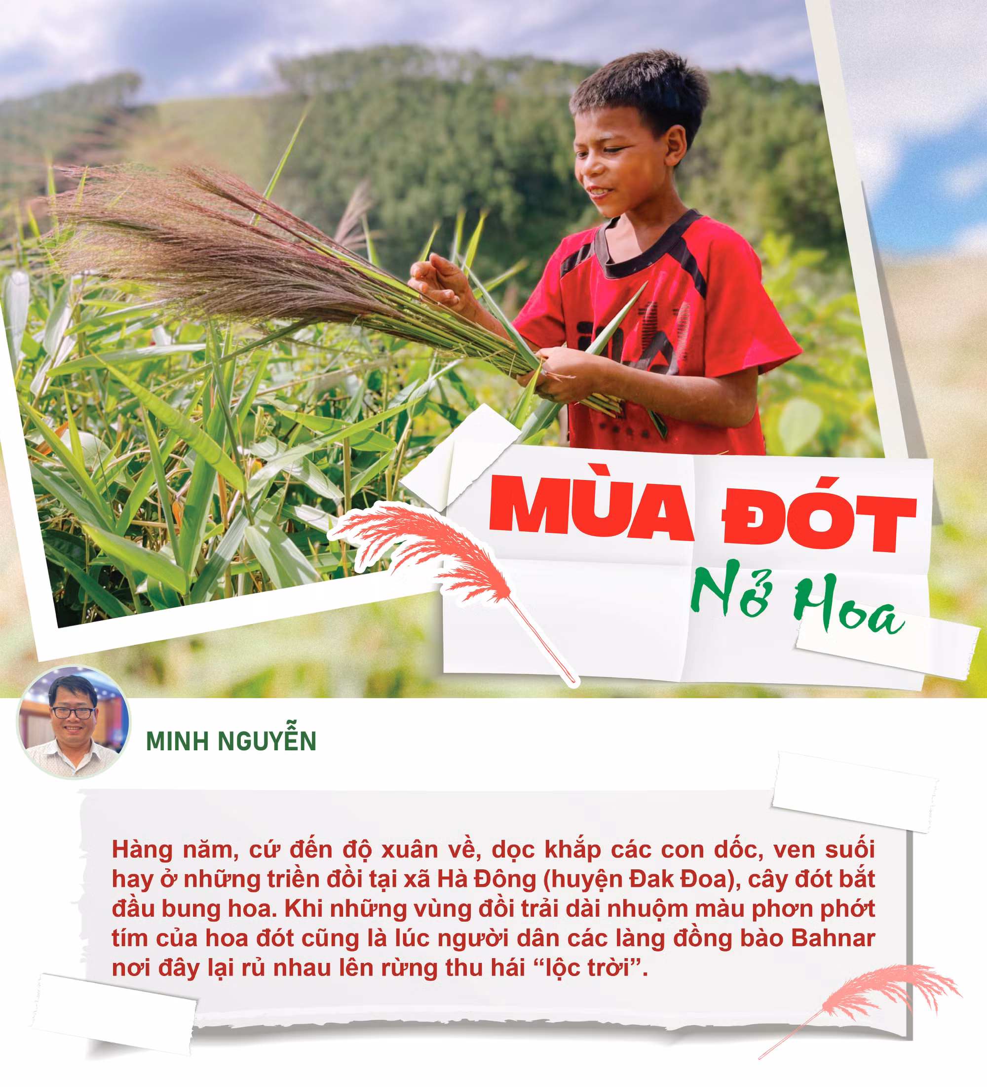 Đi cùng với chị Blăi, Tâp chỉ mới 12 tuổi nhưng khả năng thu hái đót thì không hề thua kém cánh thanh niên trai tráng trong làng. Gia đình thuộc hộ nghèo nhưng có đến 8 anh chị em nên mới học đến lớp 2, Tâp đã nghỉ học để tìm việc phụ giúp gia đình. Với Tâp, mùa đót mang đến cho em nhiều niềm vui vì phụ giúp ba mẹ có thêm thu nhập. Mặc dù vẫn còn nhiều vết cắt do lá đót rất sắc lưu vết nhưng đôi tay của Tâp vẫn thoăn thoắt giữa những khóm hoa đót mọc tua tủa. Chỉ sau vài phút, trên tay Tâp đã có một bó đót nhỏ. Thỉnh thoảng, em dừng lại, đứng tước vỏ lá làm sạch những ngọn hoa đót.