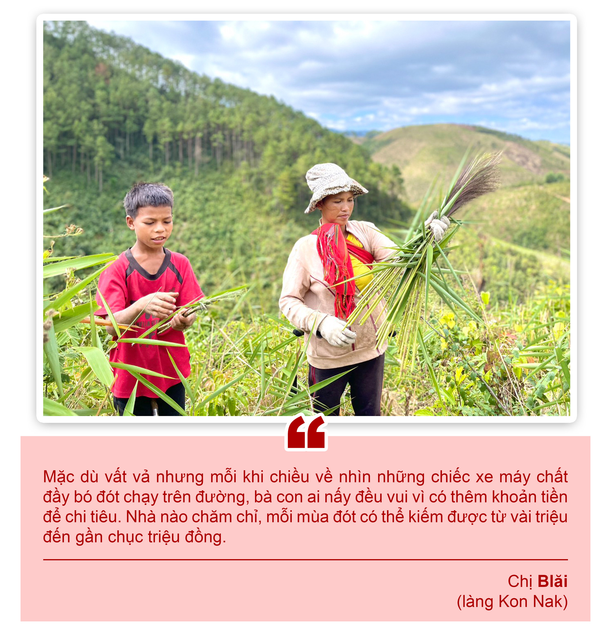 Vừa tước những chiếc lá còn dính trên hoa đót, chị Blăi (làng Kon Nak) cho biết: Thời điểm này đang vào vụ mì, nhưng dân làng mình gác lại việc thu hoạch để tranh thủ đi lấy đót. Vào đầu vụ, bà con thường thu hái đót ở khu vực ven đường, ven rẫy hay ở những con dốc gần làng. Đến khi hoa đót ở đây không còn thì lại rủ nhau đi xa hơn, mãi tít trên những quả đồi cao hoặc ở cánh rừng xa.