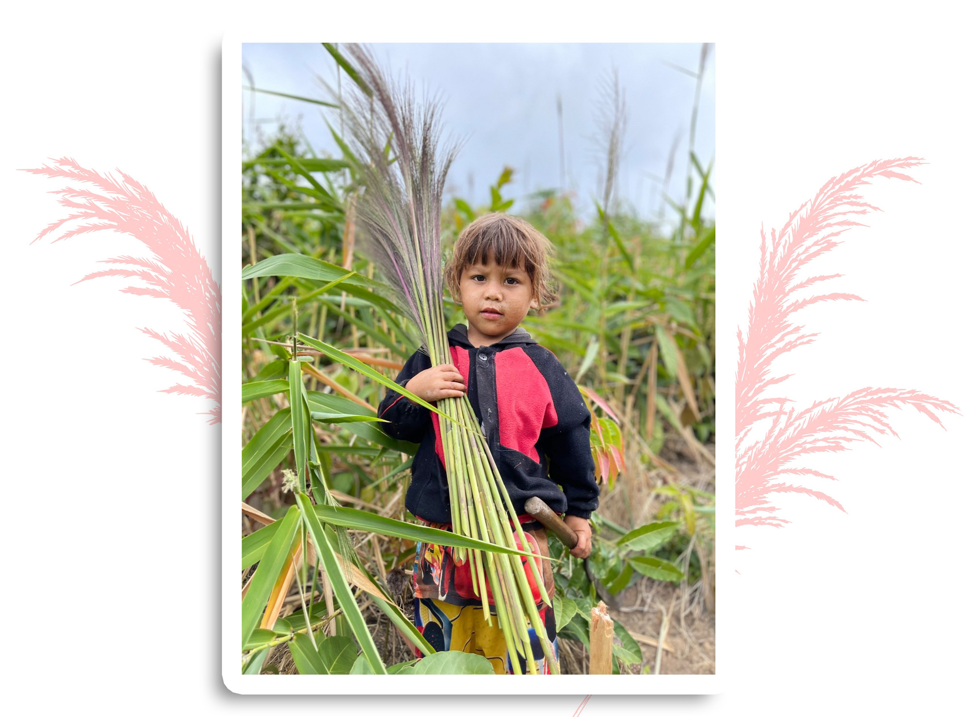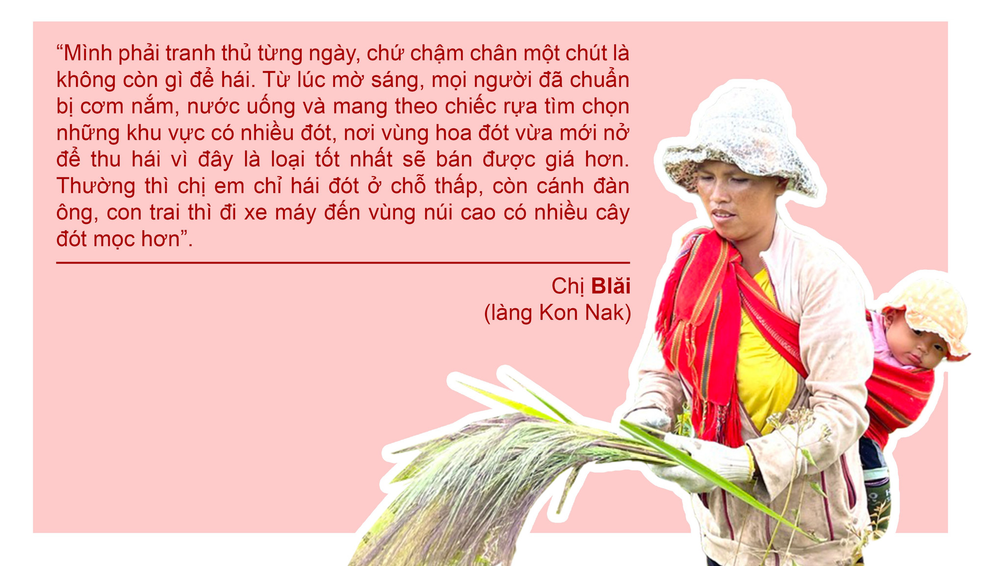 Thoạt nhìn ngọn đồi ngay tầm mắt, ai cũng nghĩ gần. Nhưng chúng tôi phải mất 15 phút vượt dốc. Từ dưới chân đồi đến nơi người dân đang hái đót nằm ở lưng chừng dốc mất hơn 10 phút leo trèo, bám víu những cây dại để khỏi bị trượt ngã. Và khi đến nơi, hình ảnh trước mắt khiến mọi mệt mỏi trong tôi thoáng chốc đã tan biến. Một người phụ nữ địu con trên lưng với đôi tay thoăn thoắt chặt từng cành hoa đót. Cách đó không xa, 2 đứa trẻ độ chừng 3 tuổi đang chơi đùa vui vẻ. Khi thu hái ở một đoạn xa hơn, chị quay lại dắt con theo. Đứa bé gần 8 tháng tuổi trên lưng mẹ say sưa ngủ. Giữa từng cụm hoa đót đang đung đưa trước gió giữa núi đồi bao la, hình ảnh mấy mẹ con hiện ra vừa đẹp, vừa yên bình.