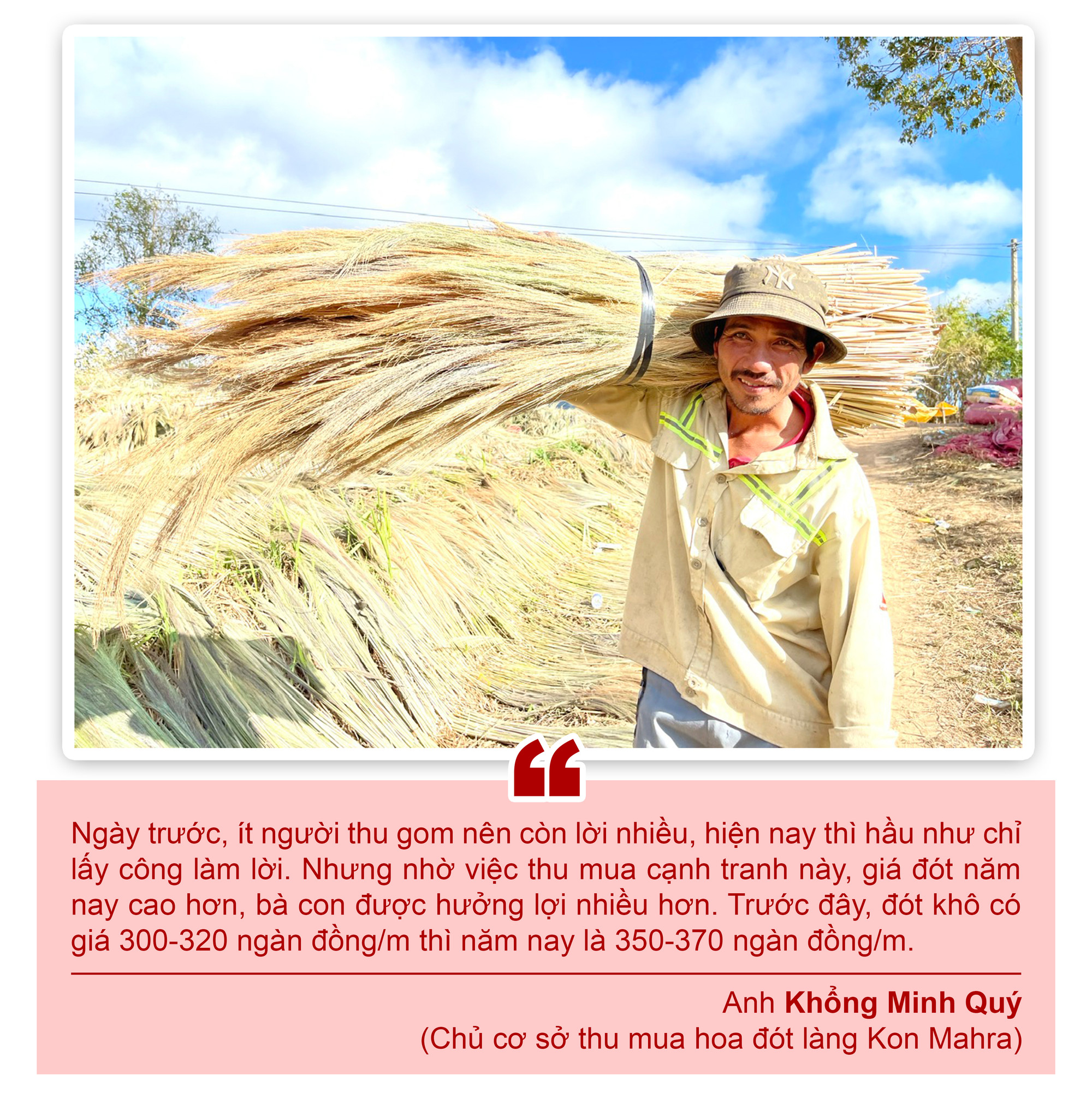 Có thâm niên gần 14 năm thu mua hoa đót của người dân làng Kon Mahar, ông Khổng Minh Quý cho biết: Hiện giá thu mua hoa đót tươi bình quân 4 ngàn đồng/kg, đót đẹp được bóc sạch vỏ lá có giá 7-8 ngàn đồng/kg. Đặc biệt, vào thứ bảy hoặc chủ nhật, tiệm tạp hóa của ông thu mua gần 1 tấn đót tươi, còn ngày thường bình quân 5-6 tạ. Sau khi thu gom, ông tìm bãi để phơi. Sau khoảng 1 tuần, khi đót khô, ông thuê người đo mét rồi bó lại thành từng bó chờ thương lái đến thu gom một lượt cùng nhiều nơi khác trong xã.