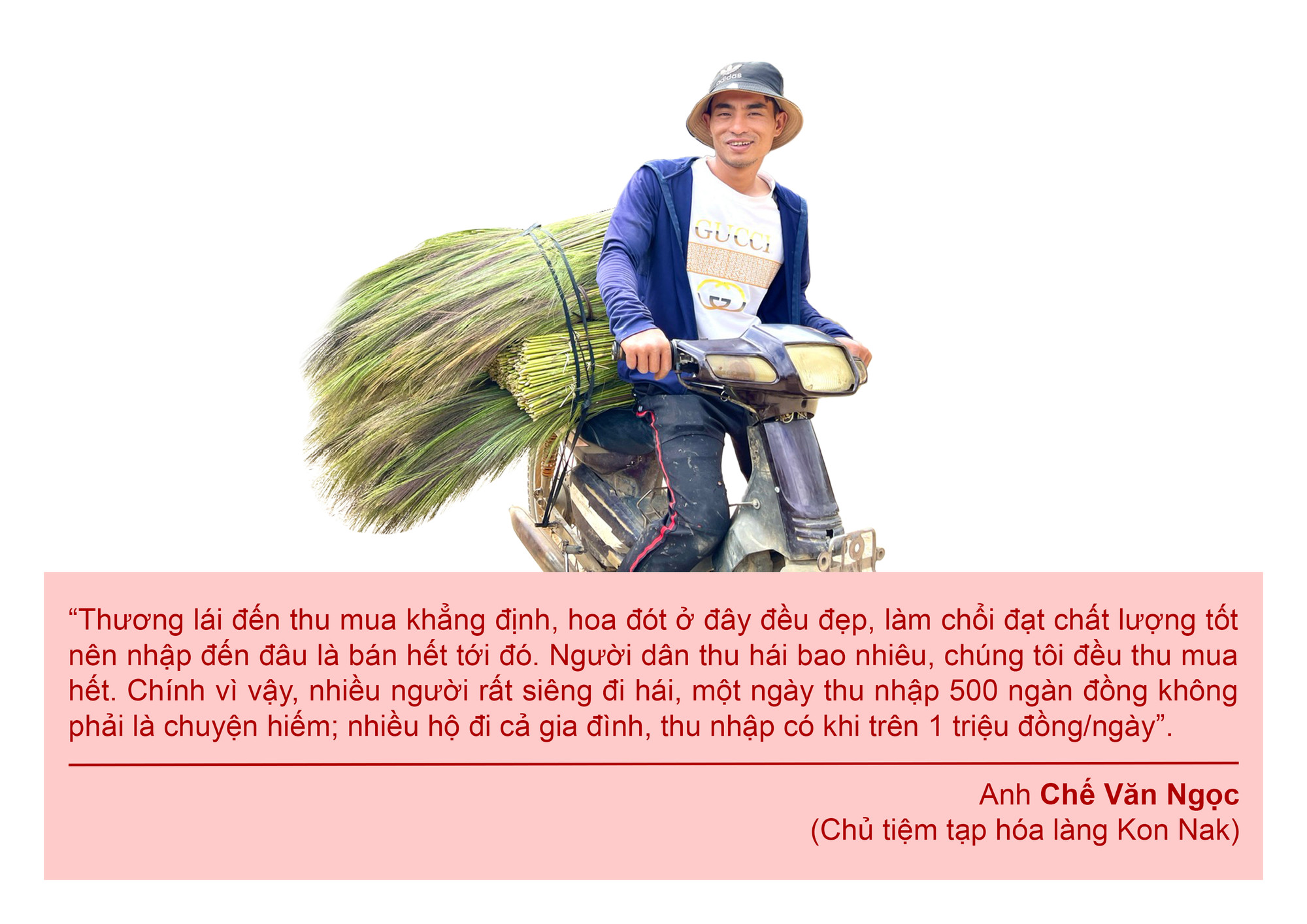 Còn anh Chế Văn Ngọc-Chủ tiệm tạp hóa làng Kon Nak thì cho hay, anh không nhớ rõ từ đầu vụ đến nay đã thu mua bao nhiêu tấn đót tươi. Nhưng mọi nơi, mọi khoảng đất trống, từ sân bóng đến sân UBND xã, hay dọc theo các tuyến đường, hễ còn chỗ trống thì anh đều tận dụng để phơi hoa đót.