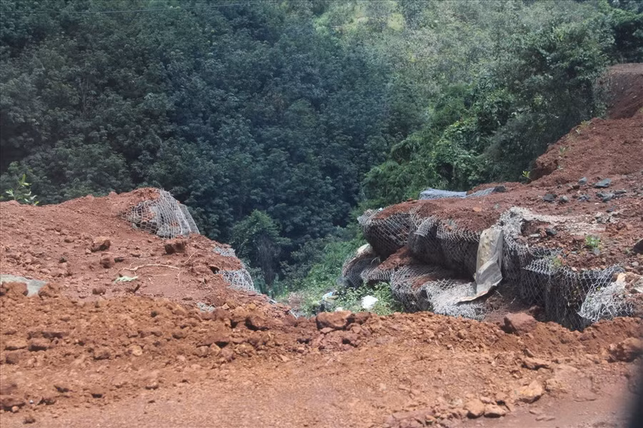 Đất, đá, cây cối từ trên đồi đổ xuống lòng đường gây ách tắc giao thông kéo dài nhiều km. Ước tính sạt lở đã khiến giao thông bị ùn tắc khoảng 5 km ở 2 đầu dốc.