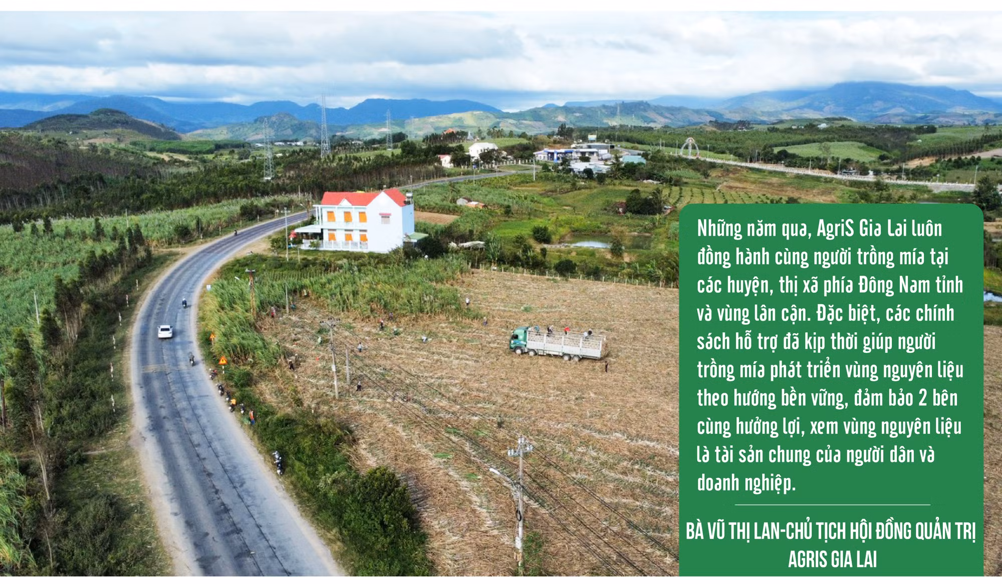 Khu vực Đông Nam tỉnh-vùng nguyên liệu của AgriS Gia Lai hiện có 14.000 ha mía. Bên cạnh ký hợp đồng đầu tư, xây dựng vùng nguyên liệu bền vững, áp dụng đồng bộ các tiến bộ khoa học kỹ thuật từ cơ giới hóa các khâu trồng, làm cỏ, bón phân, thu hoạch cũng như đưa giống kháng bệnh vào sản xuất nên năng suất mía bình quân ước đạt 80 tấn/ha, cá biệt có nơi đạt trên 100 tấn/ha.