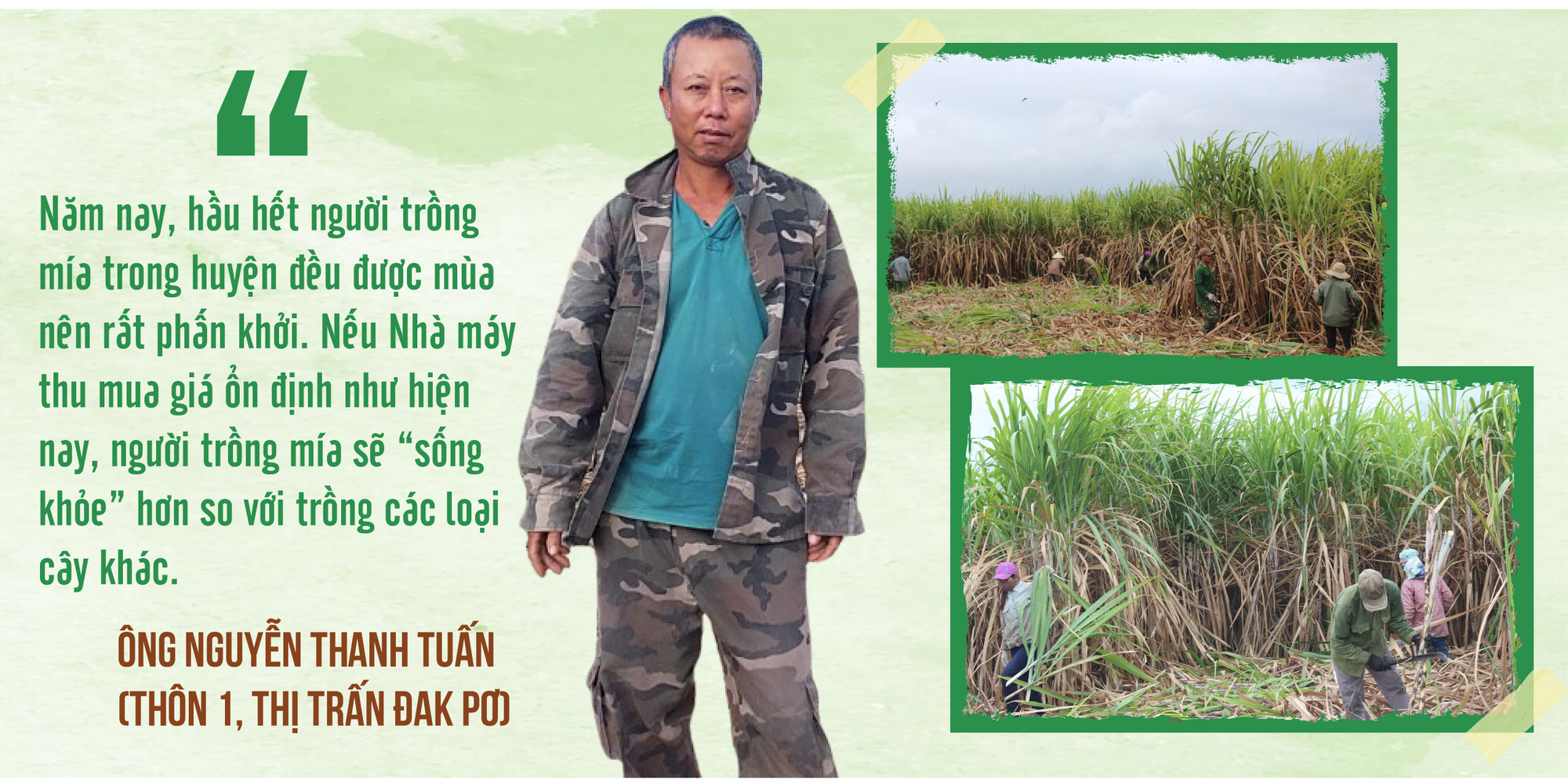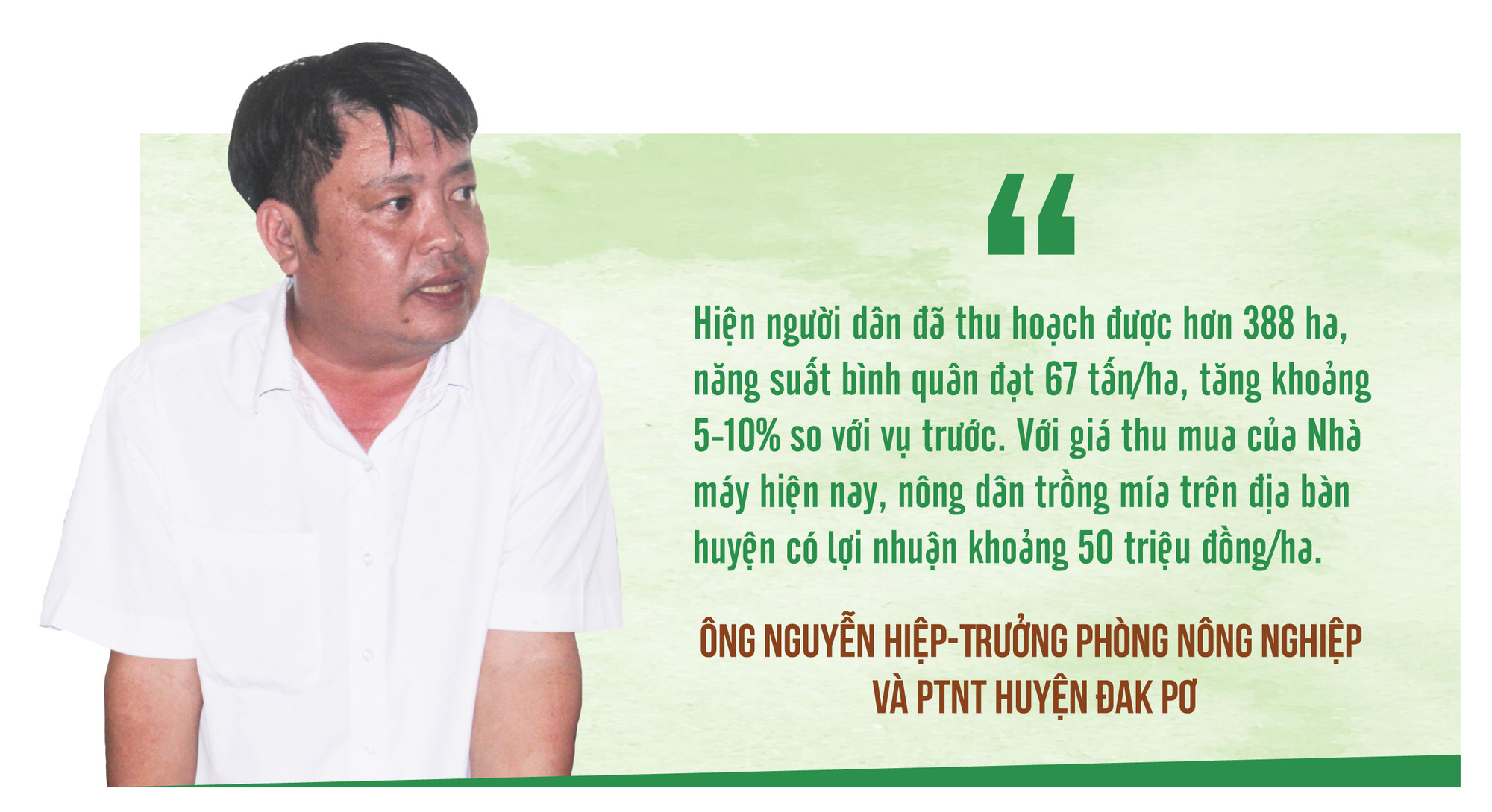 Theo ông Nguyễn Hiệp-Trưởng phòng Nông nghiệp và PTNT huyện Đak Pơ: Mía là một trong những cây trồng chủ lực của huyện cung cấp nguyên liệu cho Nhà máy Đường An Khê. Toàn huyện hiện có trên 6.000 ha mía, tập trung chủ yếu tại các xã: Hà Tam, An Thành, Yang Bắc và thị trấn Đak Pơ.