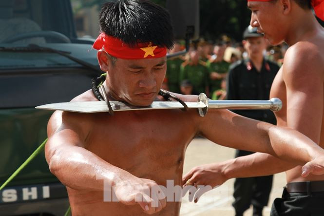 | Màn trình diễn nội công: Đẩy ô tô bằng thanh sắt kê vào yết hầu |