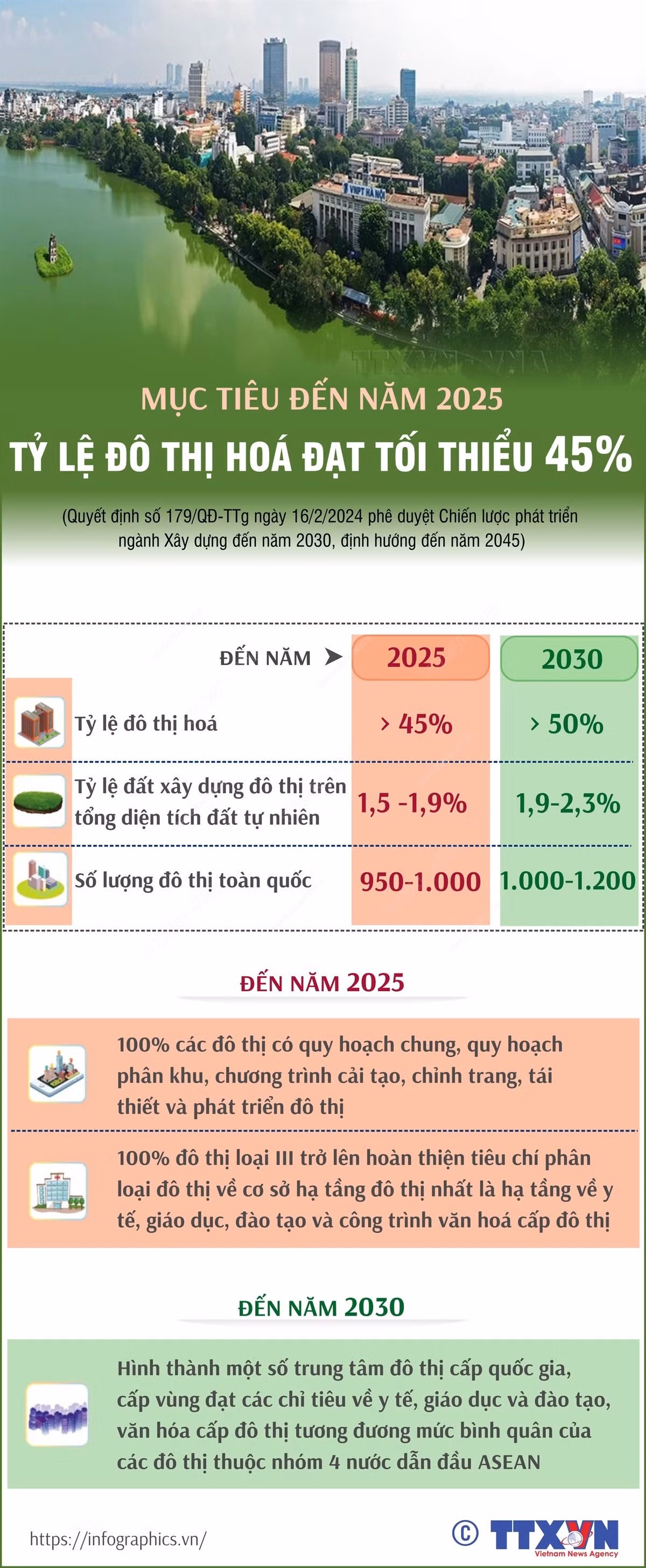 Mục tiêu phát triển đô thị đến năm 2025 là: tỷ lệ đô thị hóa đạt tối thiểu 45%, tỷ lệ đất xây dựng đô thị trên tổng diện tích đất tự nhiên là 1,5 - 1,9% và số lượng đô thị toàn quốc là 950 - 1.000 đô thị...