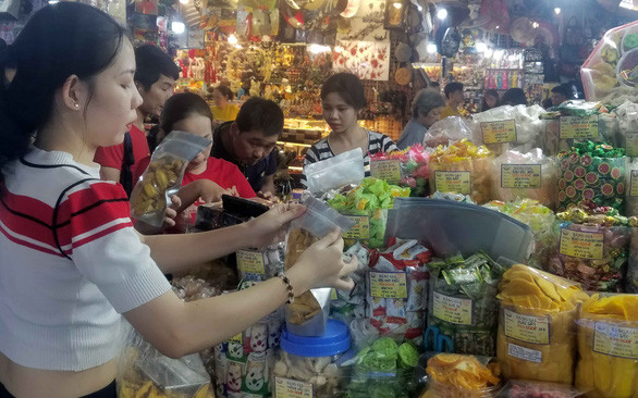 Trong đó, các gian hàng mứt tại chợ An Đông (Q.5), Bến Thành (Q.1) cũng đã nhộn nhịp hơn hẳn nhờ lượng khách bắt đầu đi mua hàng tết. Theo các tiểu thương, tiêu thụ mạnh nhất vẫn là mứt dừa (giá 80.000 - 100.000 đồng/kg), mứt gừng (100.000-120.000 đồng/kg), chưa kể các loại mứt hồng, mứt bí và mứt trái cây... Phần lớn các loại mức này đều được đựng vào một bịch khá lớn trong tình trạng "3 không": không bao bì, không nhãn mác, không nguồn gốc xuất xứ.